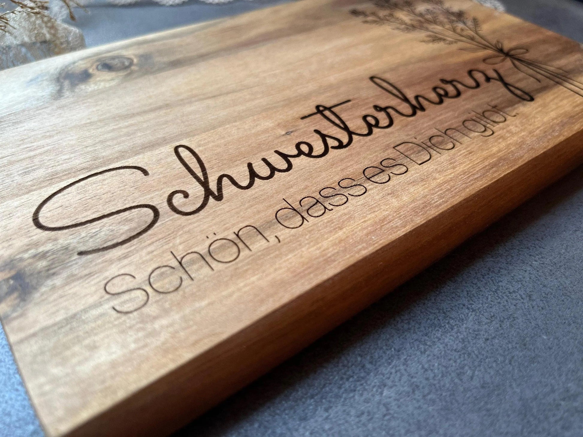 Dieses liebevoll gravierte Holzbrettchen mit dem Spruch „Schwesterherz – Schön, dass es Dich gibt!“ ist ein kleines Geschenk mit großer Bedeutung. Ob zum Geburtstag, zu Weihnachten oder einfach als Überraschung zwischendurch: Es sagt auf warme, persönliche Weise „Danke“ und erinnert jeden Tag daran, wie wichtig sie dir ist. Das Frühstücksbrettchen aus Holz ist praktisch im Alltag und gleichzeitig eine schöne Erinnerung – perfekt als Geschenk für die Schwester mit Herz.